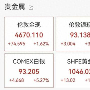 1月19日盘中,国际黄金、白银价格再创新高。现货黄金价格一度涨至4690.88美元/盎司,COMEX黄金一度涨至4698美元/盎司,涨幅均一度超过2%;现货白银价格最高涨至94.12美元/盎司,涨幅超过4%;COMEX白银价格最高涨至94.365美元/盎司,涨幅超过6%。截至发稿,以上品种涨幅均有所收窄。