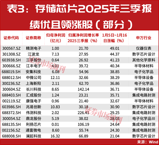 除了精测电子、鼎龙股份,还有一众存储芯片公司出现了2025年三季报业绩与股价“双击”,如长川科技、江波龙、江丰电子、安集科技、中微公司、上海新阳等(见表3)。它们多数股价均在1月以来实现了强势领涨,如长川科技2025三季报净利润同比增长了142.14%,1月以来股价累计上涨了超36%。