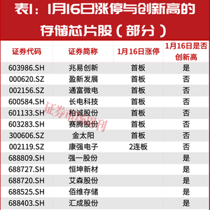 最近,存储芯片涨停潮与创新高共振的行情进一步上演,如以1月16日的数据来看,有包括兆易创新、通富微电、长电科技、赛腾股份、金太阳、康强电子等在内的近10只个股集体涨停。与此同时,兆易创新、佰维存储、中科飞测、江波龙等在内的近30只个股创出历史新高(见表1,前复权)。