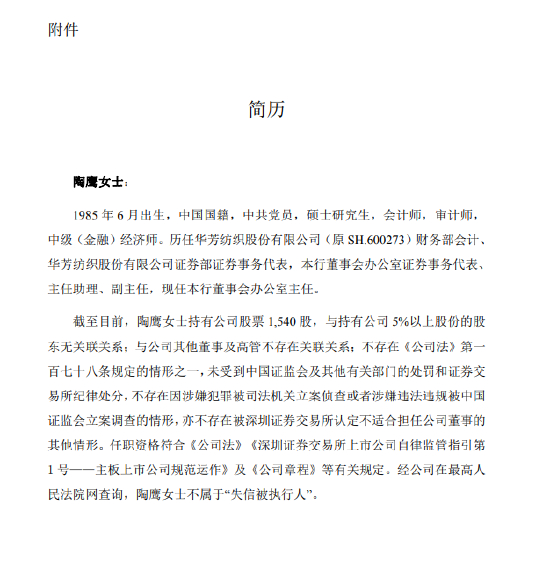 简历信息显示,陶鹰,1985年6月出生,曾任华芳纺织财务部会计、证券部证券事务代表,张家港行董事会办公室证券事务代表、主任助理、副主任,现任张家港行董事会办公室主任。