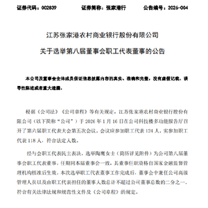 1月19日金融一线消息,张家港行公告,公司于2026年1月16日召开职工代表大会会议,选举陶鹰为董事会职工代表董事,任期同本届董事会一致。
