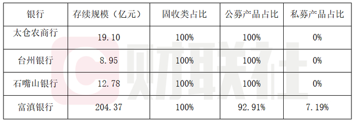 产品结构方面,表3显示,四家银行均呈现“清一色”的固定收益类产品布局,未涉及任何权益类、商品及金融衍生品类等高风险产品。太仓农商行、台州银行和石嘴山银行的公募产品占比达100%,富滇银行公募产品占比也高达92.91%,仅少量布局私募产品。