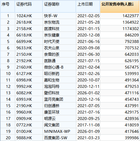 值得注意的是,证券时报记者统计相关数据后发现,港股新股认购人数的巅峰期出现在2020年和2021年间,其中2021年上市的快手、京东物流、医渡科技的公开发售认购人数超过百万人,快手的认购人数超过142万人。