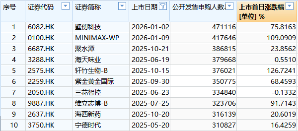而从2025年以来上市的新股中,认购人数超过30万人的仅有10家公司,认购人数最高的为1月2日上市的壁仞科技,认购人数超过47万人。
