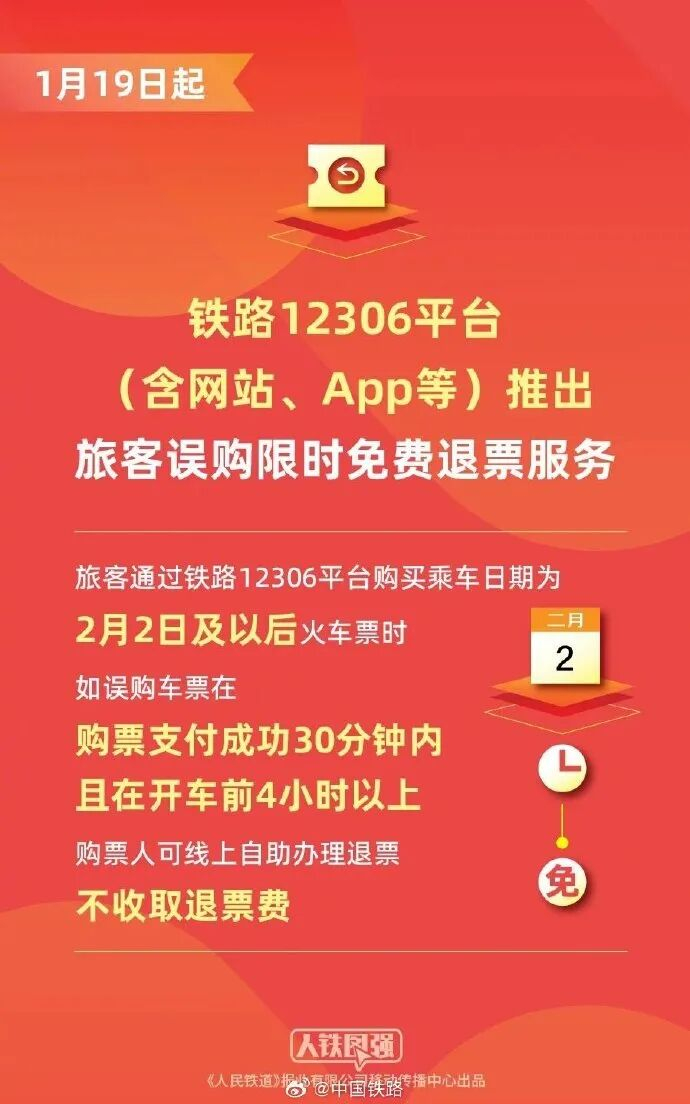 据@中国铁路 消息,1月19日起,铁路12306平台(含网站、App等,下同)推出旅客误购限时免费退票服务,旅客通过铁路12306平台购买乘车日期为2月2日及以后火车票时,如误购车票在购票支付成功30分钟内且在开车前4小时以上,购票人可线上自助办理退票,不收取退票费,将进一步提升旅客购票体验。
