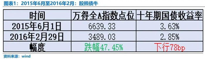 历史数据也印证了这一规律。2015年6月至2016年2月,万得全A下跌47.45%,十年期国债收益率下行78bp。“跷跷板效应”引发资金在股债之间的再流动。当股市持续走低、情绪低迷时,资金会倾向于流入债市,债市走牛。2016年1月,股市经历两次熔断,“千股跌停”再现,刚刚恢复的上升势头也被拦腰截断,债市在震荡回调中趋于稳定。