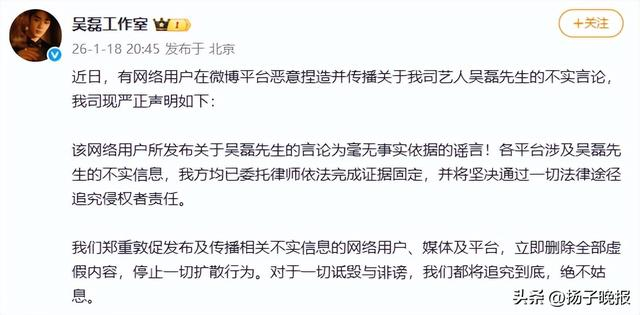 1月18日,一网友称有艺人床照,并喊话吴磊:“吴磊你欠我的拿什么还”,引发相关话题的热议。演员吴磊工作室官方微博发布声明称相关言论不实。