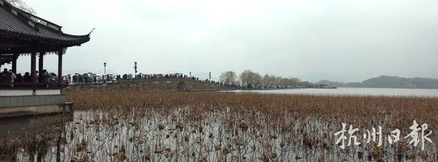 西湖边一早挤满了来看雪的人