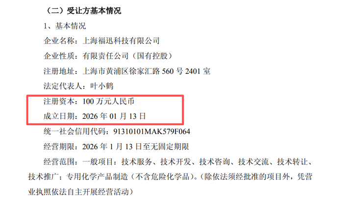 据公告显示,江化微此次控制权变更的受让方上海福迅成立于《转让协议》签署的6天前(2026年1月13日),注册资本仅100万元,企业性质为有限责任公司(国有控股)。