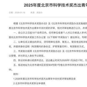 1月19日,北京市科学技术委员会、中关村科技园区管理委员会官网发布了《2025年度北京市科学技术奖杰出青年中关村奖评审结果公示通知》。