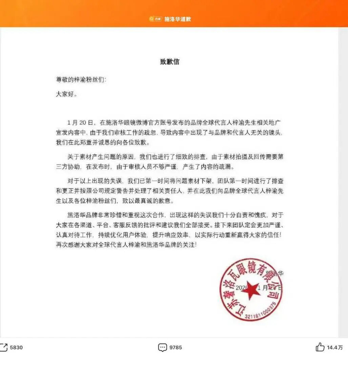 1月20日下午,施洛华眼镜在其微博官方账号发布致歉信,称与品牌全球代言人梓渝相关的广宣发内容中,由于审核工作的疏忽,导致内容中出现了与品牌和代言人无关的镜头,在此郑重并诚恳的向各位致歉。