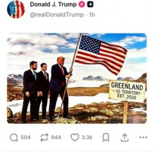 美国总统特朗普1月20日凌晨在社交媒体上发布图片,他手拿美国国旗登上格陵兰岛,身后站着美国副总统万斯和国务卿鲁比奥,旁边指示牌上写着“格陵兰岛2026年成为美国领土”。