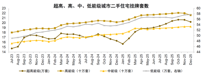 行业基本面上,1季度重点关注供给侧自然库存变化趋势。自2025年下半年以来,剔除季节性和同比基数影响后,一、二手房交易量整体呈低位走稳态势。在此基础上,供给侧出现一定积极变化,一方面是新供土地体量同比走弱,另一方面是12月超高/高能级城市挂牌量环比回落,个别城市挂牌量回落已持续1个季度上下。考虑到近期数据变化仍可能受到岁末年初季节性和频密政策带来的阶段性预期调整影响,我们认为春节后还需要重点关注自然库存变化趋势,这对于研判后续房价走势十分重要;此外,也须关注宏观经济环境对总住房交易量的影响,对此我们延续此前报告中交易量磨底期、跌幅逐步收窄的基本判断。
