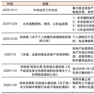 规划政策先行,2026年重点关注存量住房收储政策进展。《通知》一方面加强城市更新中详细规划适应性,加速更新项目进展,另一方面对存量土地和房产资源设定最长5年内原规划条件不动的过渡期政策。我们认为该政策可能在规划层面增强了存量住房收储的可行性,此前存量住房收储的核心堵点是收储用途所决定的收购定价低于商品住房市价,过渡期政策理论上讲或能适度提高收购定价、弥合价差,但仍需融资支持方面的配套政策。继2025年12月经济工作会议[2]明确房地产方面的核心任务是“控增量、去库存”后,北京限购政策调整[3]、二手房交易增值税率下调[4]、《求是:改善和稳定房地产市场预期》[5]、换房个税优惠延期[6]、本次的存量资源规划过渡期政策[7]陆续出台,近期地产政策的频密度显著提升;我们认为2026年需要把握“控增量、去库存”的宗旨,尤其关注新增供地和存量住房收储政策的进展。