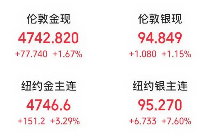 截至收盘,国际金价再创新高。纽约期金价格涨逾3%,伦敦金现货价格涨逾2%,纽约期银价格涨逾6%。