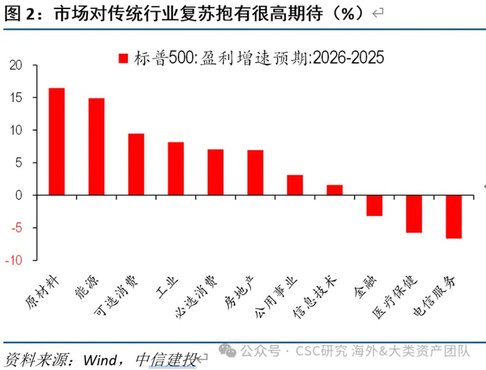一方面,降息、减税等政策利好下,市场对2026年美国经济出现复苏的期待较高,即使近期就业数据一般,衰退担忧几乎未出现。一个典型例子是,美股分行业盈利预测来看,2026年传统周期行业(原材料、能源、工业、消费、地产等)均系统性改善。