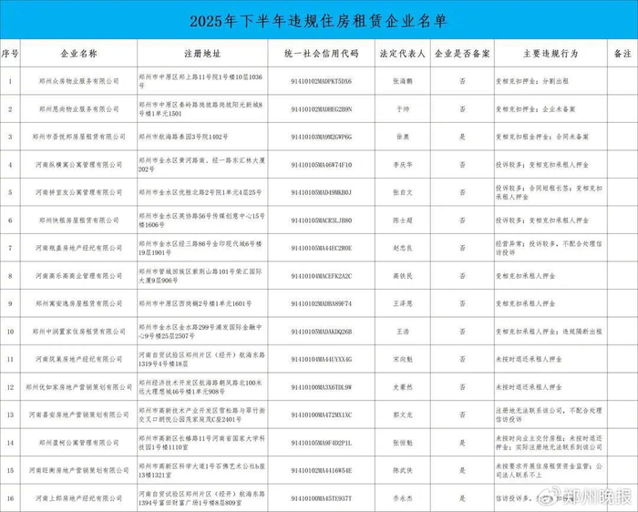 近期,郑州市住房保障和房地产管理局结合2025年下半年全市房屋租赁信访投诉情况,排查出16家住房租赁企业存在严重违规行为,涉及变相克扣租房押金、房屋隔断出租、企业不备案、租赁合同不备案、未按要求开展住房租赁资金监管、推诿投诉调解等问题,严重侵害租客权益。