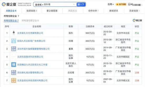 爱企查App显示,田朴珺名下关联5家开业企业,版图涉及影视、科技、健康等领域,具体包括深圳市圣朴骏辉健康管理有限公司、北京承礼文化传媒有限公司等。