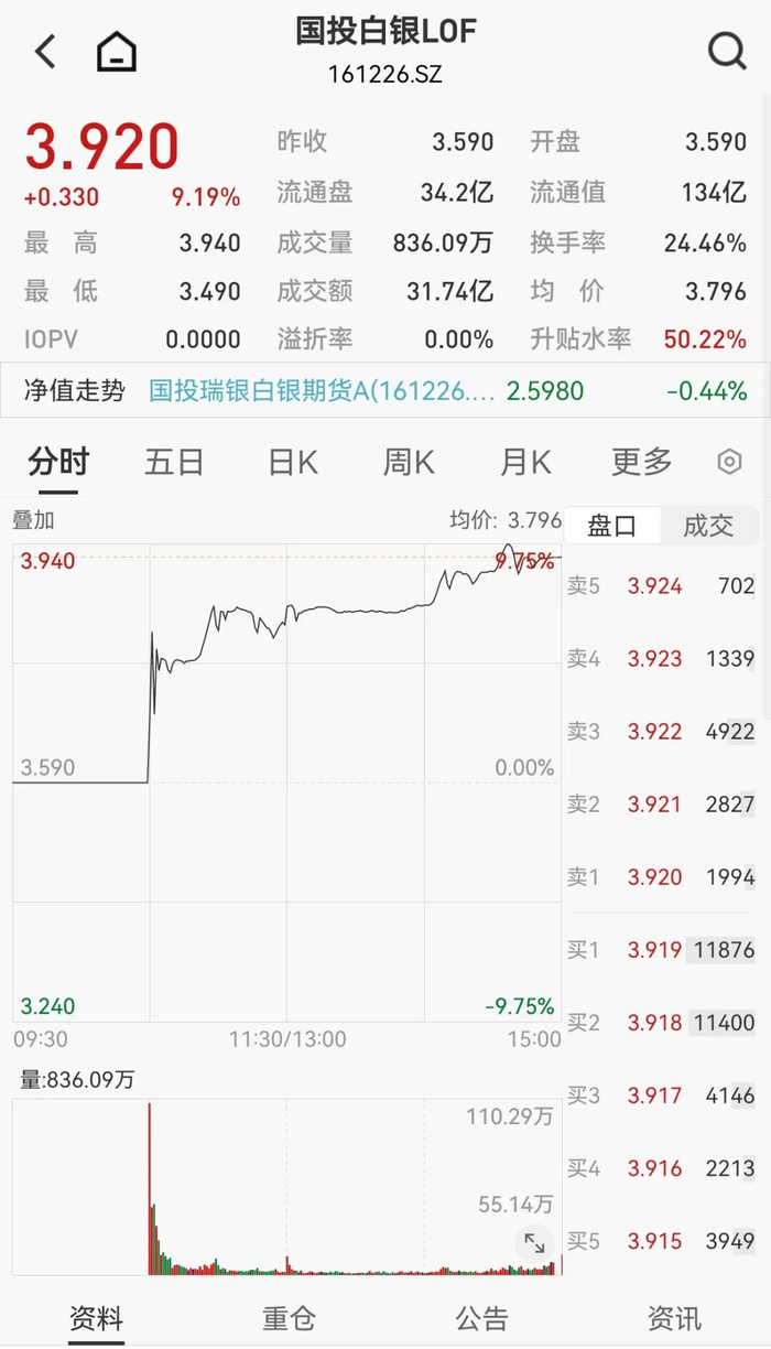 由于套利资金有限叠加国际银价上涨,Wind数据显示,截至1月21日收盘,国投白银LOF二级市场价格报收于3.92元,溢价率超50%。