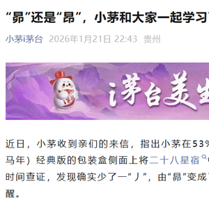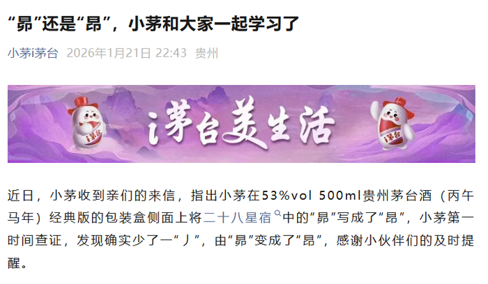 i茅台官微1月21日晚间发布消息称,近日有消费者反馈,53%vol 500ml贵州茅台酒(丙午马年)经典版包装盒侧面所印二十八星宿中的“昴”字误写为“昂”,缺少一“丿”。平台核实确系印刷错误,并第一时间向用户致谢。