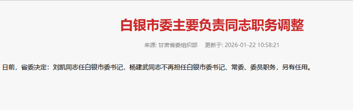甘肃省委决定:刘凯任白银市委书记 新京报网 01.2211:16 关注 新京报讯 据甘肃组工网消息,日前,甘肃省委决定:刘凯同志任白银市委书记,杨建武同志不再担任白银市委书记、常委、委员职务,另有任用。