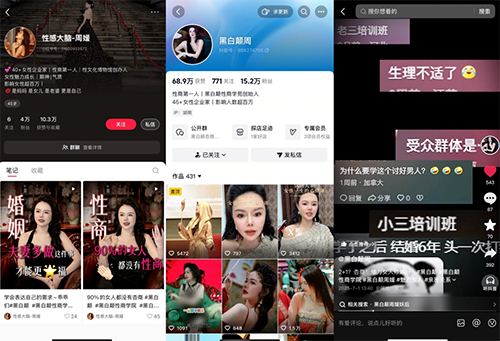 突然走红的周媛在抖音、小红书等平台均设有账号,总粉丝量接近20万。其简介自称是“黑白颠性商学苑”创始人,并标榜为“性商第一人”、45+女性企业家,影响人数超百万。