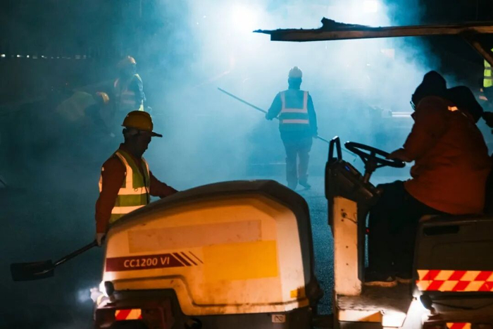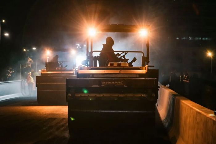 1月21日晚11时40分许,随着一台沥青铺筑机与4台压路机的轰鸣声响起,装载沥青的罐车开始卸料,10多位手持铁锹、推板等工具的工人各司其职,开始三台石路跨线桥西侧半幅桥面沥青罩面摊铺作业。