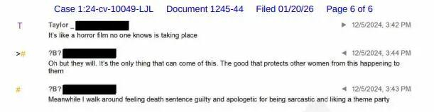 霉霉在2024年12月初发给布莱克的短信提到贾斯汀和他当时即将在《纽约时报》上发表的反击文章:“我觉得这个碧池知道要出事了,因为他已经开始装腔作势了。”