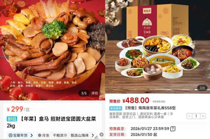 线下门店也同样的预订爆满。“陶陶居在上海有7家门店,年节期间会有两轮预定,现在已经是基本订满的状态。”陶陶居市场经理王蕾向21世纪经济报道记者介绍道,“我们只有过年期间会供应盆菜,都是在年夜饭的宴席上会有预定。盆菜也适合多人用餐的场景,我们有准备3—4人份、6—8人份的两个规格,内有鲍鱼、鸭掌、鸡腿、花椒等食材,味道都比较受上海消费者的欢迎。”