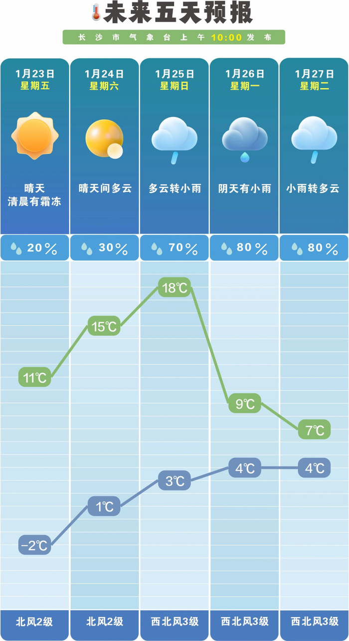 周末行程怎么安排?那得看“天”行事。据长沙市气象台预计,明天(周五)长沙晴天,清晨有霜冻,气温-2℃至11℃,最高气温明显升高;24日(周六)晴天间多云,气温升到1℃至15℃,阳光继续相伴;25日(周日)多云转小雨,气温进一步攀升到3℃至18℃,但随着雨水到来,体感上会有些湿冷;26日(下周一)阴天有小雨,气温骤降到4℃至9℃,寒意浓浓;27日(周二)小雨转多云,气温4℃至7℃,湿冷感将更加明显。