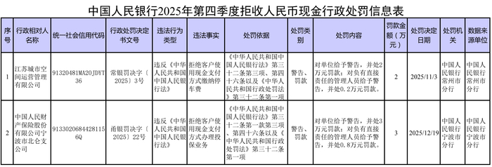 具体来看,江苏城市空间运营管理有限公司拒绝客户使用现金支付方式缴纳停车费,中国人民银行常州市分行对单位给予警告,并处2万元罚款;对负有直接责任的管理人员给予警告,并处0.2万元罚款。