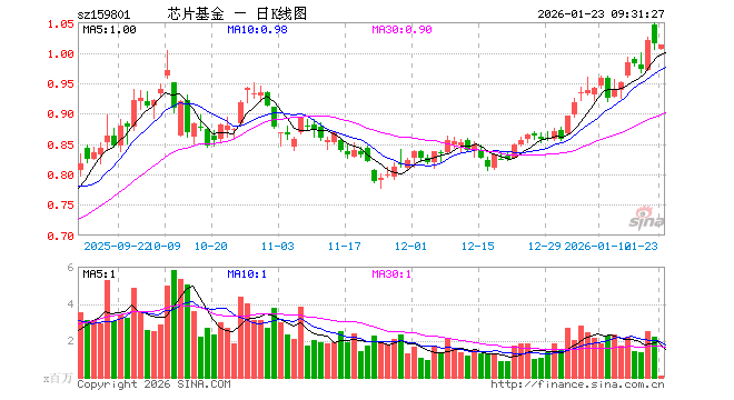1月23日,芯片ETF广发(159801)开盘跌0.89%,报1.005元。芯片ETF广发(159801)重仓股方面,中芯国际开盘涨0.00%,海光信息跌4.33%,寒武纪跌1.18%,北方华创涨0.29%,兆易创新跌1.81%,中微公司涨0.01%,澜起科技跌2.80%,豪威集团涨0.01%,拓荆科技涨0.00%,长电科技涨0.00%。