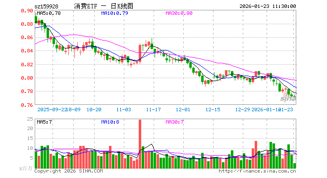 消费ETF(159928)涨0.00%,半日成交额1.95亿元