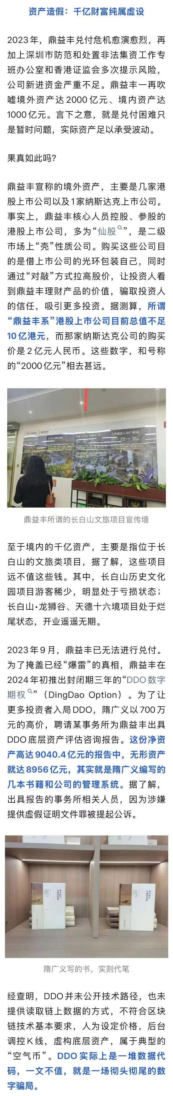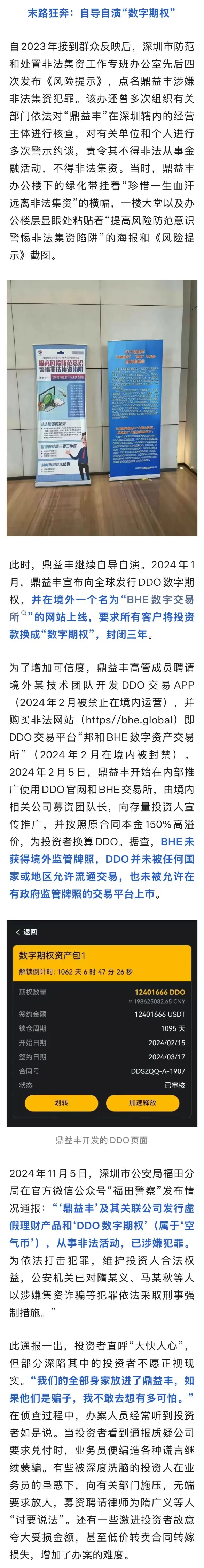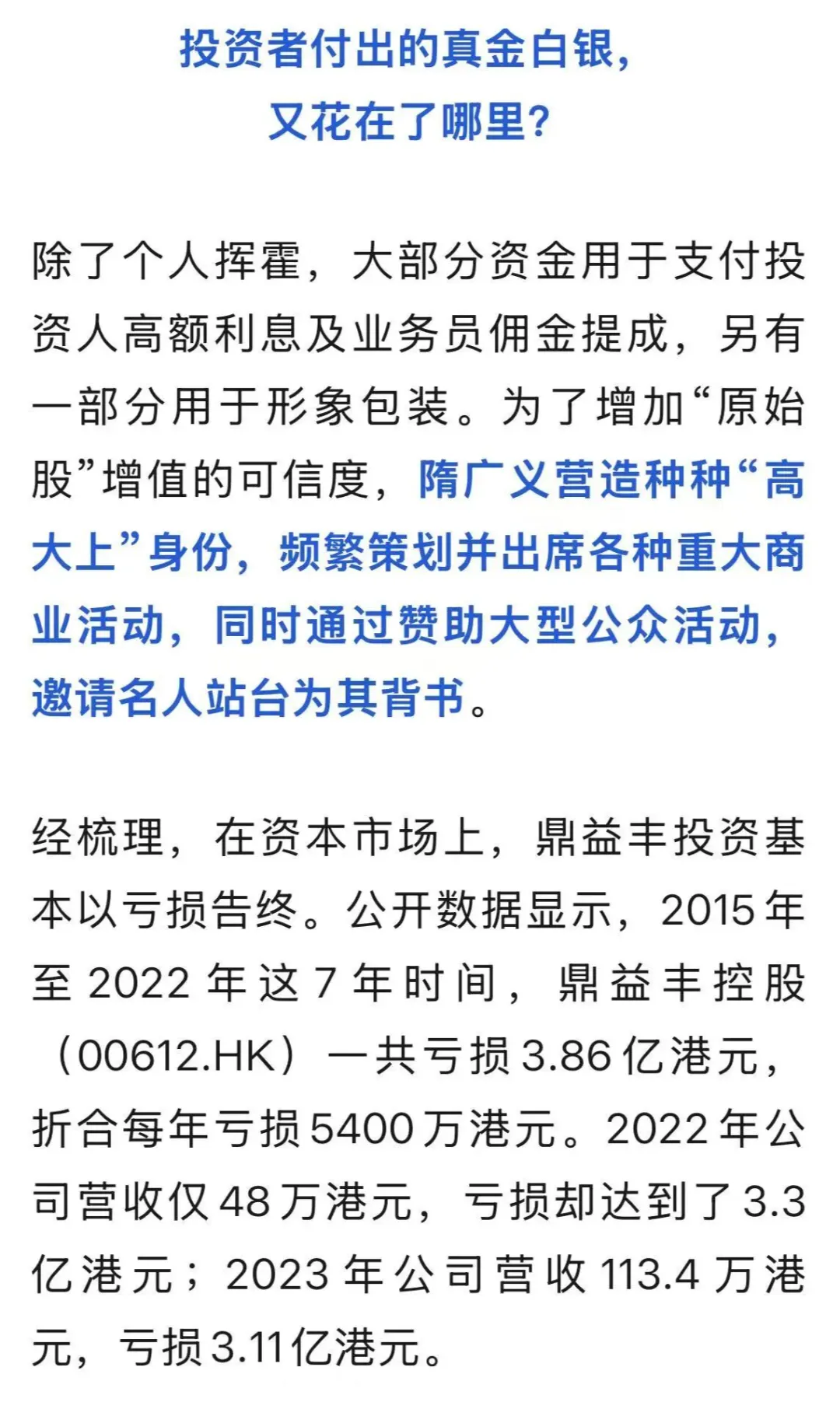 近年来,深圳市防范和处置非法集资工作专班办公室先后四次发布《风险提示》,点名鼎益丰涉嫌非法集资、诈骗,还对有关单位和个人进行多次警示约谈。2024年11月5日,公安机关对隋广义、马小秋等人以涉嫌集资诈骗等犯罪依法采取刑事强制措施。
