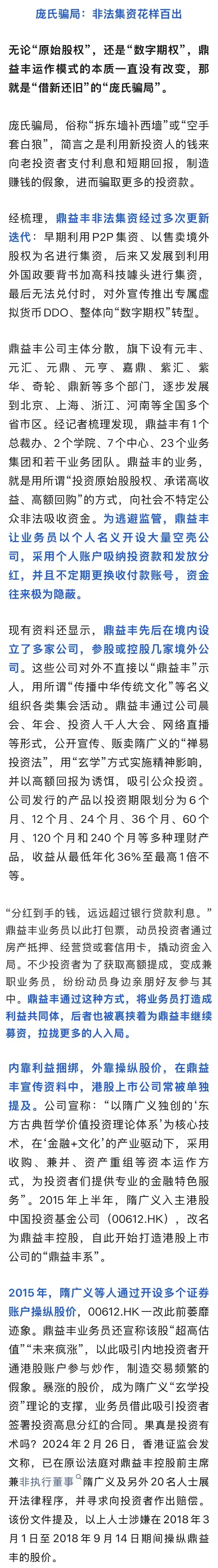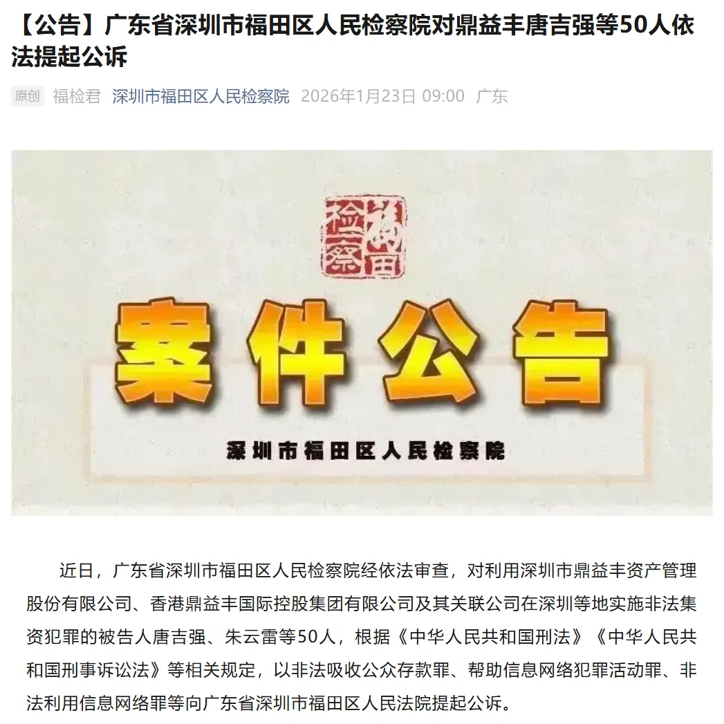 2026年1月23日,广东省深圳市人民检察院发布公告,近日,对鼎益丰核心成员隋广义、马小秋等30人以集资诈骗罪、非法吸收公众存款罪等罪名依法提起公诉。另外,广东省深圳市福田区人民检察院对鼎益丰唐吉强等50人依法提起公诉。