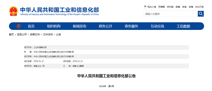 中华人民共和国工业和信息化部公告(2026年第1号)-中国质量新闻网