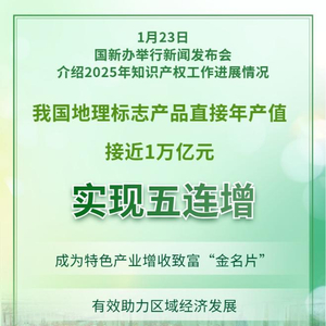 1月23日,国家知识产权局副局长芮文彪在国新办新闻发布会上表示,我国地理标志产品直接年产值接近1万亿元,实现五连增,成为特色产业增收致富的“金名片”,有效助力区域经济发展。