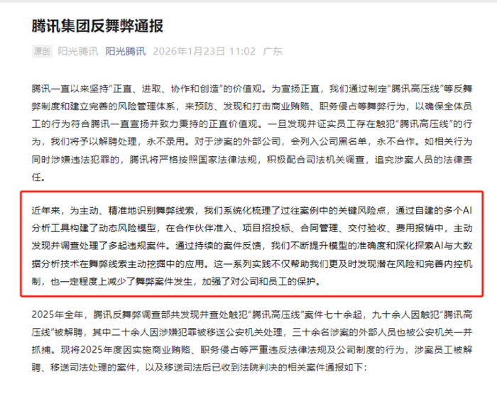 腾讯持续反腐,与过往不同的是,特别提及了技术手段尤其是AI赋能反腐的实践。
