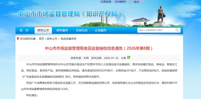 广东省中山市市场监督管理局食品监督抽检信息通告(2026年第8期)