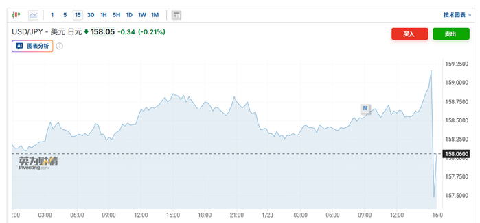 1月23日,日元兑美元汇率盘中跌破158关口,为1月14日以来首次。