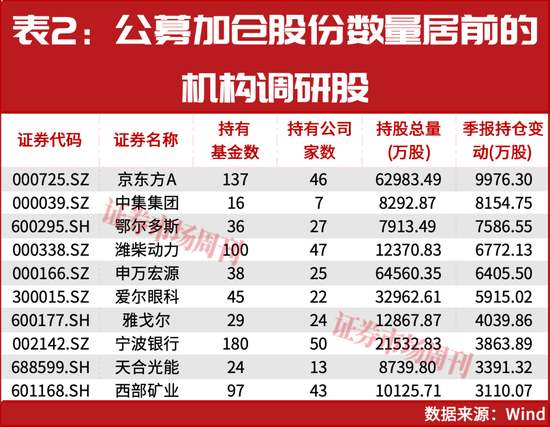 具体来看,公募加仓股份数量最多的是京东方A,加仓股份数量接近1亿股,其次分别是中集集团、鄂尔多斯、潍柴动力、申万宏源、爱尔眼科等(见表2),普遍与商业航天、半导体、脑接机口三大主线相关。