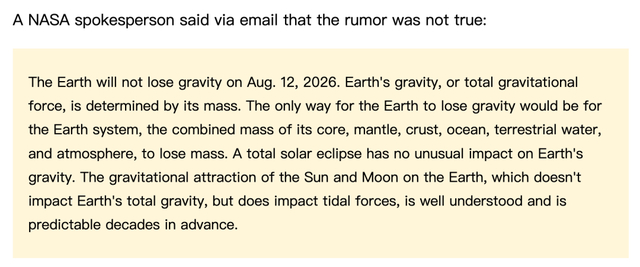 面对谣言扩散,NASA通过国际权威事实核查网站Snopes明确表态:“地球绝不会在2026年8月12日失去引力,这一说法毫无科学依据”。