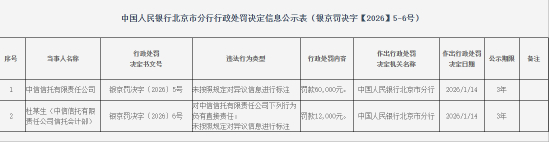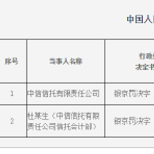 1月23日金融一线消息,中国人民银行北京市分行行政处罚决定信息公示表(银京罚决字〔2026〕5—6号)显示,中信信托有限责任公司因未按照规定对异议信息进行标注,被处以罚款6万元。同时,杜某生(中信信托有限责任公司信托会计部)因对上述违法违规行为负有直接责任,被处以罚款1.2万元。