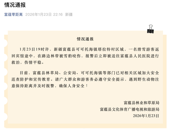 1月23日19时许,新疆富蕴县可可托海镇塔拉特村区域,一名滑雪游客返回宾馆途中,在路边林带被雪豹咬伤,报警后立即被送往富蕴县人民医院进行救治,伤情平稳。