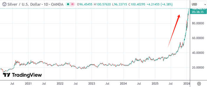 周五(1月23日)纽约时段,现货白银升破100美元,最高时涨4.5%报每盎司100.58美元。年初至今银价已累涨逾40%,在2025年银价已实现了近148%的年度涨幅。
