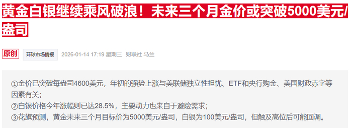 财联社1月24日讯(编辑 赵昊)在避险资产需求激增、全球各地散户疯狂买入推动下,现货白银价格历史性地突破了每盎司100美元大关,延续了近期的炽热涨势。