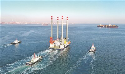 2026年1月22日,由中船武汉船机海西重机自主设计建造的新一代自升式海上作业支持平台从青岛西海岸新区离泊赴中东(无人机照片)。 新华/传真