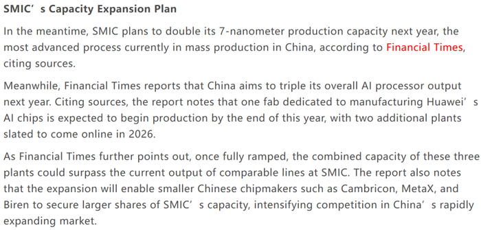 图片说明:中芯国际7nm产能或于2026年翻倍、同时AI芯片产能提高三倍,数据来源于Financial Times