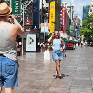 题图来源:2025年夏天,外国游客在南京路步行街上留影。