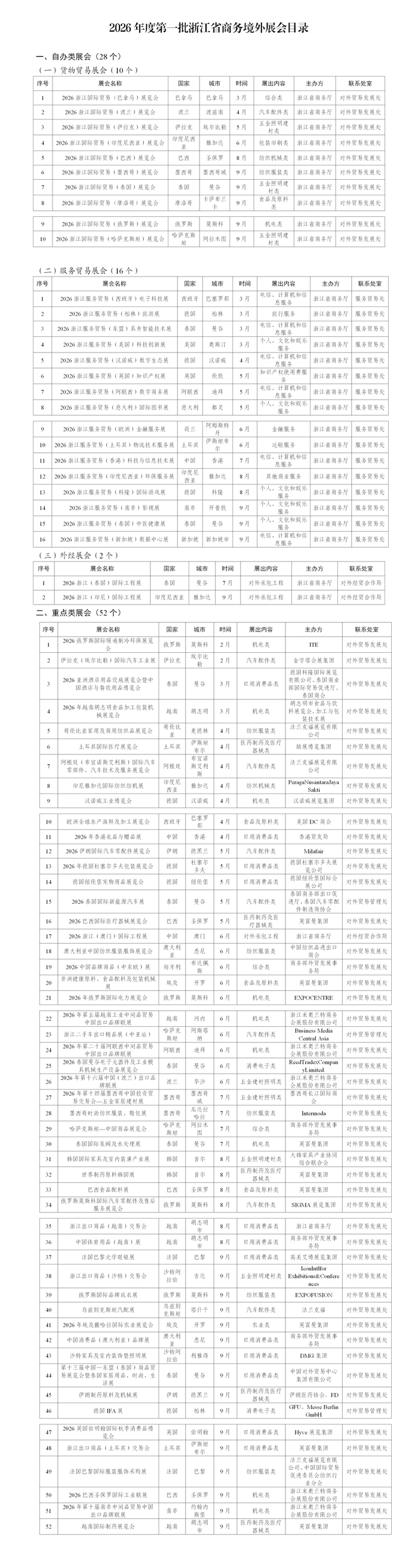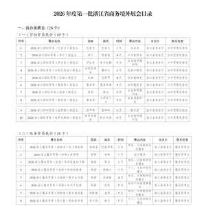 为进一步发挥好展会拓市场、增订单的积极作用,全力支持企业抢抓外贸订单,结合省商务厅有关文件及企业需求,市商务局发布2026年度第一批义乌市境外展会支持目录。据介绍,2026年境外展支持目录由省级和市级构成,省级分自办类和重点类展会,市级分成熟型(举办5年以上,200个以上展位)和培育型展会,具体目录如下: